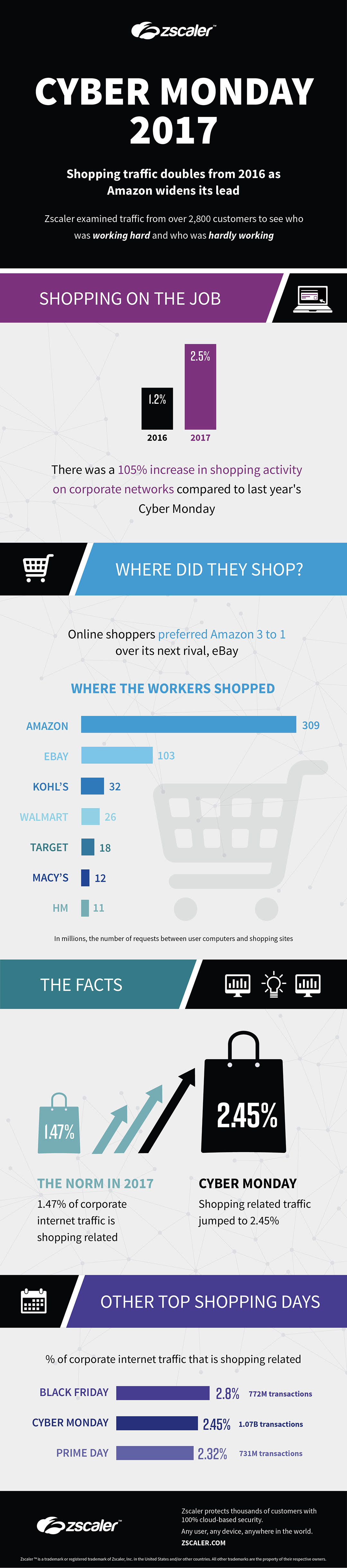 As workers returned to work after the Thanksgiving holiday, it was clear they were ready to get back to business - the business of online shopping. Cyber Monday shopping at work doubled from 2016 to 2017 according to data sourced from the Zscaler network.