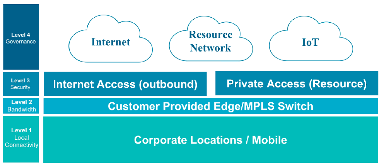 In the Siemens model, level one and two address local connectivity and bandwidth — how do we connect users to the internet? What service providers are involved, and how do we route the user to the internet as quickly as possible?