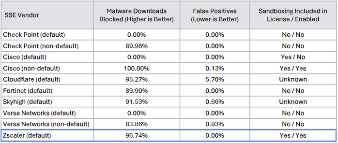 In its default configuration, Zscaler stands above our competitors in the mini-test of SSE platforms: Zscaler blocked about 97% of the malware test samples with no false positives. Zscaler also includes Cloud Sandbox capability out of the gate, unlike several of our competitors.