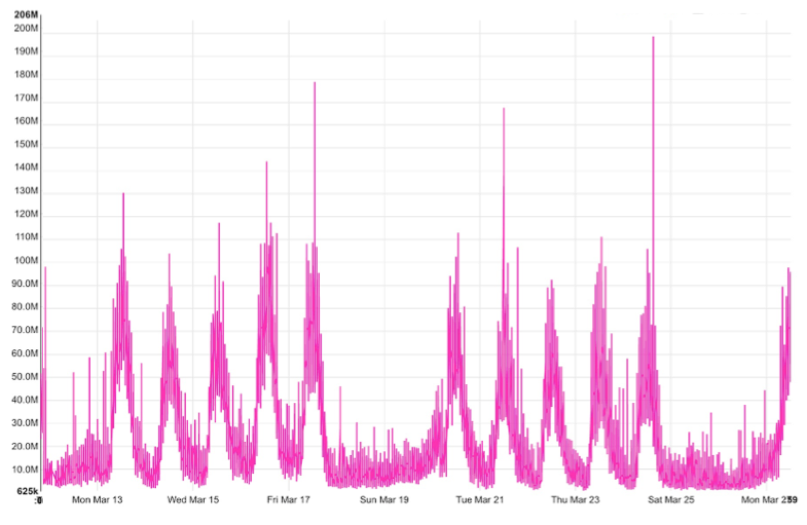 Now the important thing to note here is that although there was a spike in transactions around March 16-17, during the first round of the tournament, the number of bytes processed in our cloud remained relatively constant. The reason? This is in no small part due to most Zscaler customers implementing bandwidth control on their networks. This means that spikes in traffic have no impact on critical business applications. That definitely sounds like a win to me.