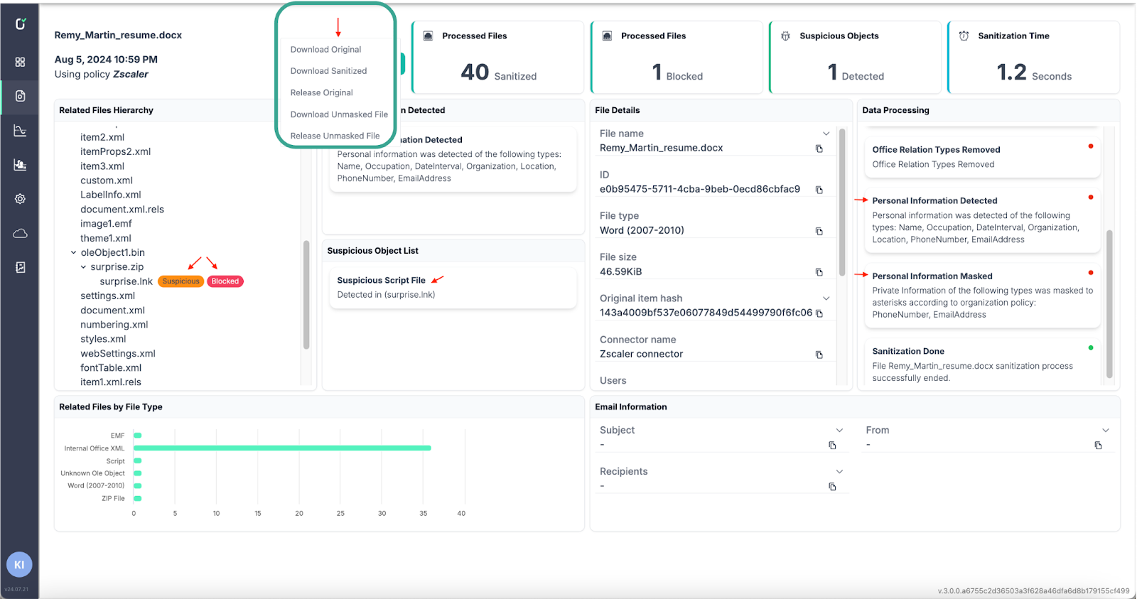 Data Protection: Any images are reconstructed as part of the sanitization process, eliminating any hidden code, without compromising the quality. The process is also applied for images embedded in documents and in archive files. Moreover, any QR codes are disarmed as well, this effectively thwarting any steganography attacks.