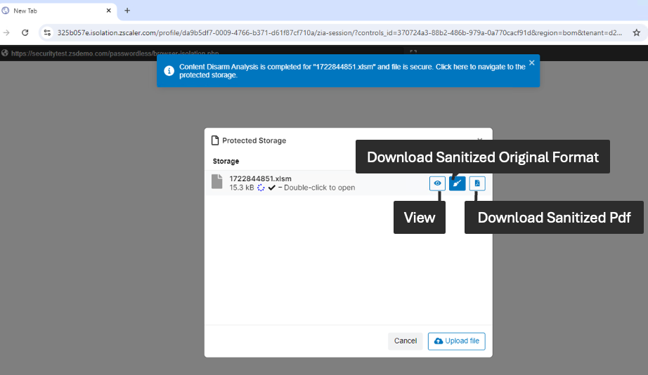 The Zscaler Zero Trust Exchange platform protects thousands of customers from cyberattacks and data loss by securely connecting users, devices, and applications in any location. Zscaler Browser Isolation, natively integrated within the platform, detonates the web content and isolates any associated zero day threats in an air-gapped cloud container, while enforcing clipboard, upload/download, read-only etc. controls and streaming safe pixelated content to the user’s favorite browser. The built-in document processing technology can allow the productivity related files (docx, pptx, vsdx, rtf etc.) to be safely viewed within isolation (‘protected storage’) or downloaded as sanitized pdf (Level-1 CDR).