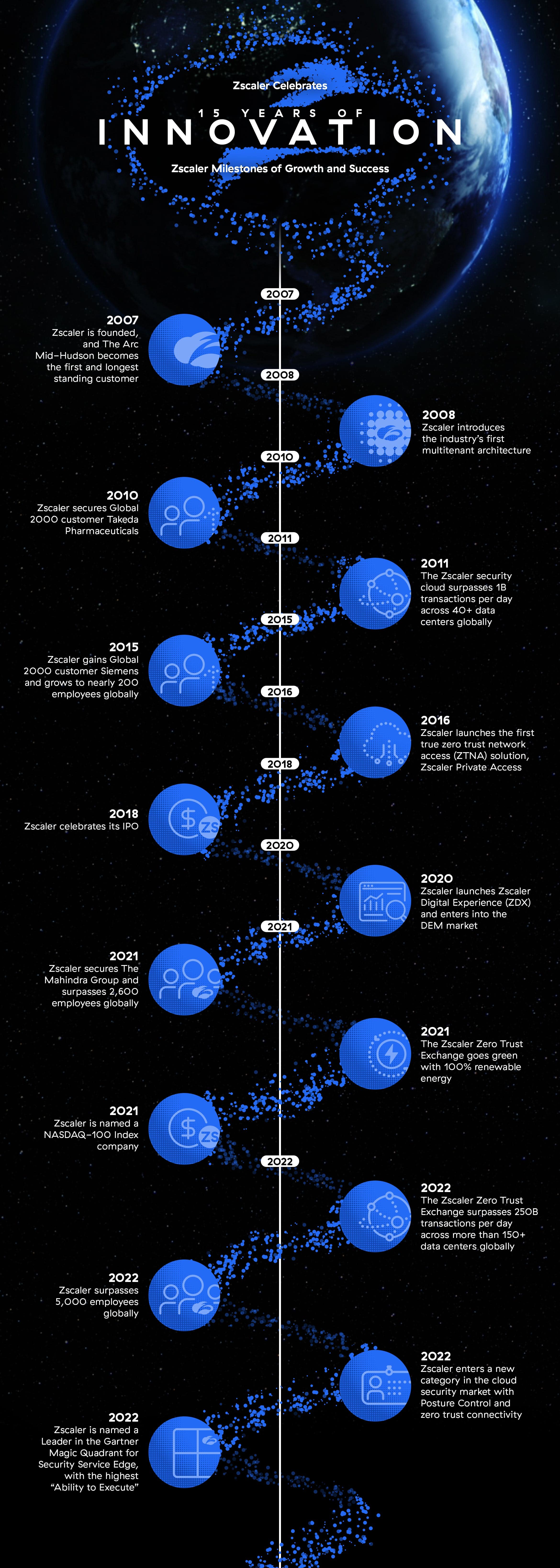 Zscaler started in 2007 with an idea: transform cloud security in ways we never thought possible. Fifteen years later, with numerous industry firsts, notable technology triumphs, and significant company milestones throughout our history, Zscaler is in the perfect position to support our customers as they continue their digital transformation journeys. We’re beyond excited about the future. Join us as we celebrate 15 years of innovation.