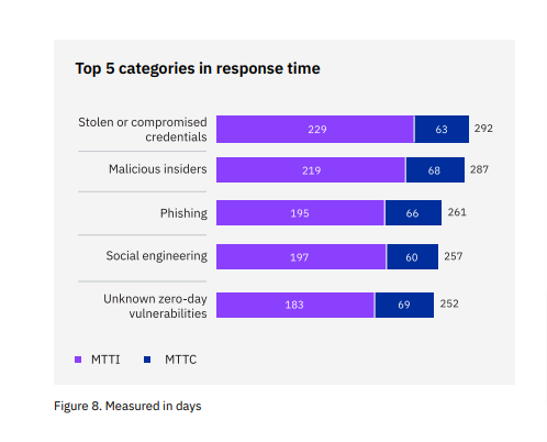 Fig: Average response time to identify and contain breaches caused by common attack vectors, IBM Cost of a Data Breach Report 2024