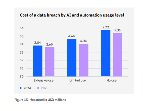 Fig: Cost of a data breach by AI and automation usage level; IBM Cost of a Data Breach Report 2024
