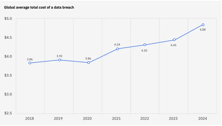 Notable stats: The global average cost of a data breach surged to $4.88 million in 2024, reflecting a 10% increase from 2023—the largest annual spike since the pandemic. The main factors contributing to this increase are the costs associated with business disruption, lost customers, and post-breach responses, such as regulatory fines and customer remediation efforts.