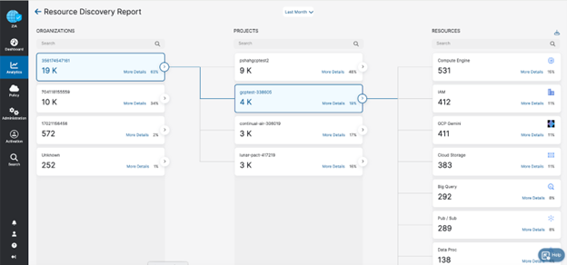 This provides a drill-down view of Organization -> Projects -> Resources. Customers can find the list of projects which are part of the discovered organization and each resource part of projects.