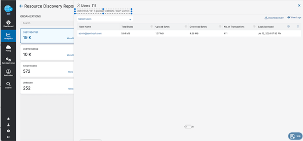 We have also provided individual widgets for the top organizations, projects, resources and users. Each widget can be filtered by “Number of Transactions” and by its “Upload/Download Data”. This will help customers understand how much data is getting uploaded to non-corporate/personal GCP resources.