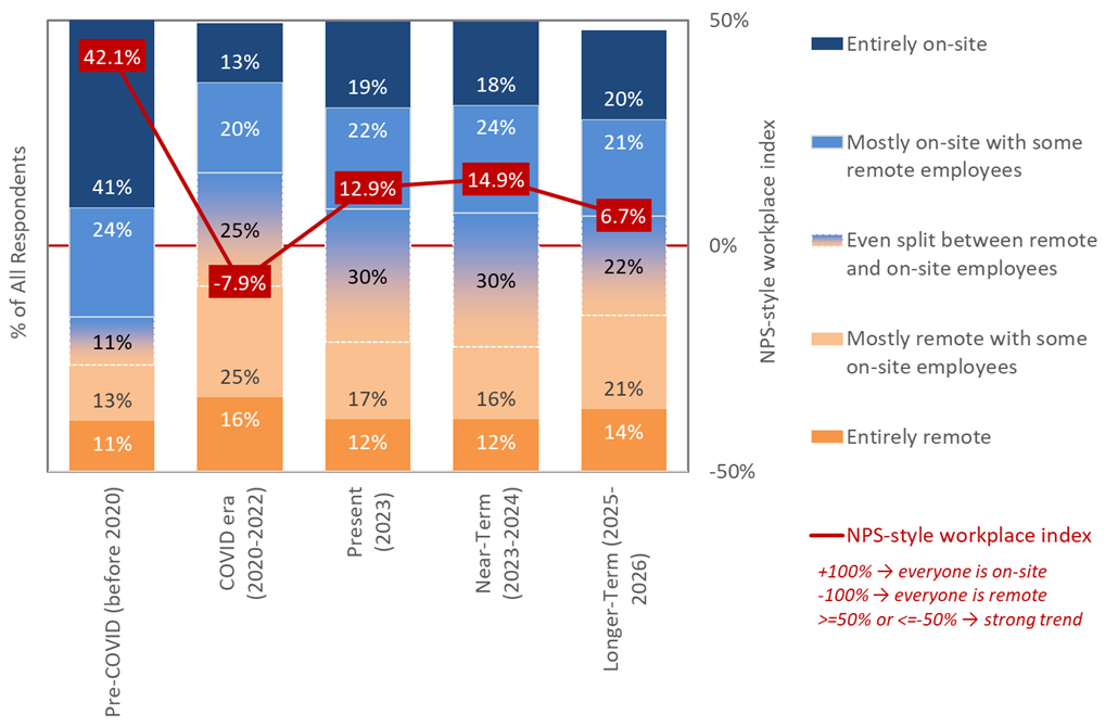As a simplified view of how the workplace has evolved over just the last few years, Figure 1 also incorporates a net workplace index — inspired by the well-known net promotor score (NPS) — in which +100% means that all respondents are entirely or mostly on-site, -100% means that all respondents are entirely or mostly remote, and values of +50% and higher or -50% and lower are generally considered indicators of a strong trend. In this context, the sharp and sudden shift from +42.7% to -7.9% underscores the unprecedented impact of the global pandemic on the modern workplace. Post-pandemic, this index returned to a “new normal” range of +12.9% to +14.9%. Looking forward, however, the future of the workplace is only slightly skewed towards on-site (+6.7%). Said another way: For most organisations, a remote / hybrid workforce is projected to be here to stay.