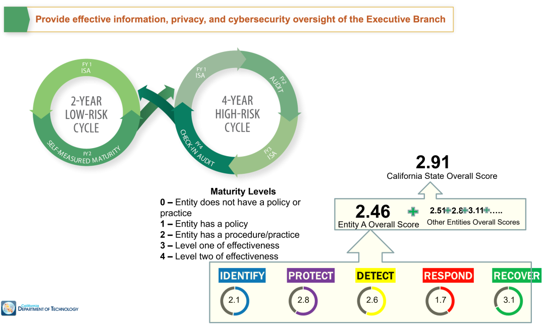 A key aspect to the program is how to measure and govern state agencies so that they're moving and solving the right priorities at the right time. Cal-Secure includes a four-year and a two-year risk oversight cycle. There are multiple engagements that are applied to state agencies to measure what their policy procedure and policy framework is within a department. The California Maturity Metric Model is then applied to measure the effectiveness of how security controls are implemented and test the various security controls applied within the framework.