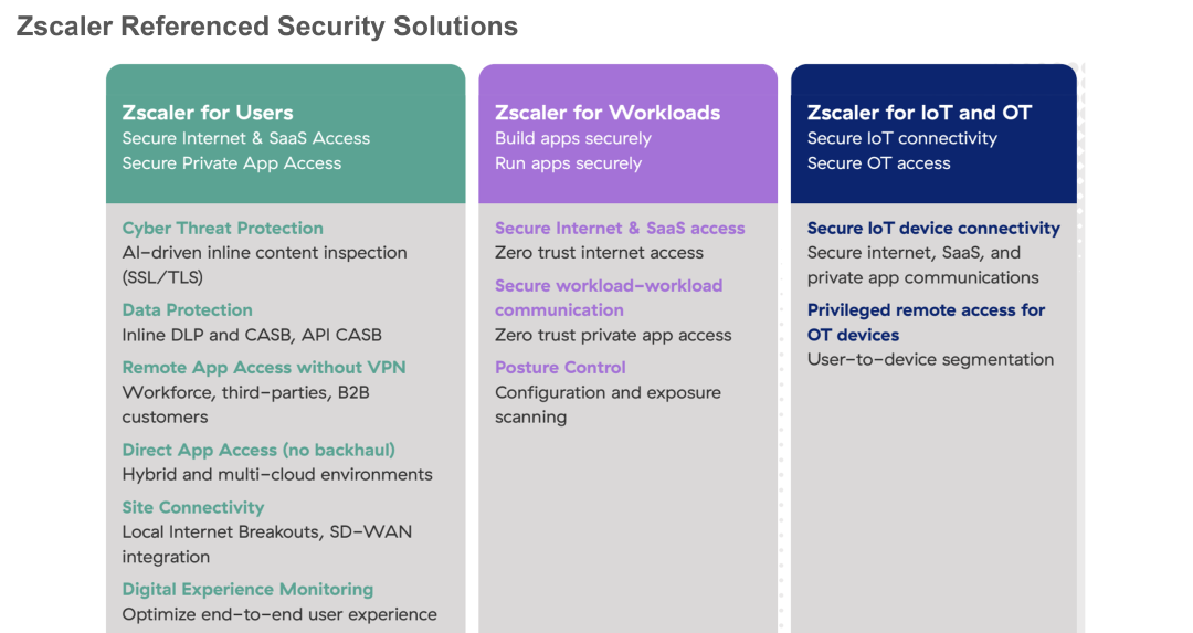 Zscaler for Users provides secure internet and SaaS access and secure private application access to deliver zero trust security around remote workforce, remote users, data centers and branch offices. Zscaler for workloads addresses cloud security, secure internet SaaS access, secure workloads, workload communication, and posture control for cloud environments. Zscaler for IoT/OT delivers secure IoT device connectivity and privileged remote access for OT devices.