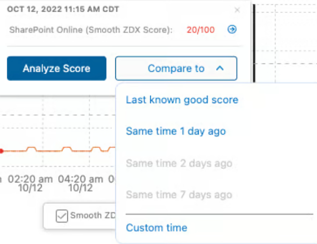 Single point in time mode: Allows you to select a specific point on a low ZDX score and run an analysis on what could have caused the score to dip at the specific time, which provides insight into what’s going on with an end user’s experience in a matter of seconds.