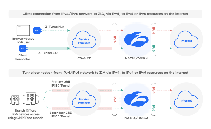 Enterprises that are deploying IPv6-only networks can use the Zero Trust Exchange to connect users and devices to IPv6-only or dual-stack applications. The Zscaler Client Connector (ZCC) will tunnel IPv6 client traffic over Z Tunnel 2.0, and deliver it to a Zscaler Data Center over the IPv4 Internet. Note that if you’re running an IPv6-only network, this will require a NAT64 function to ensure that this traffic can be routed through “IPv4 islands” on the Internet to a Zscaler Data Center.