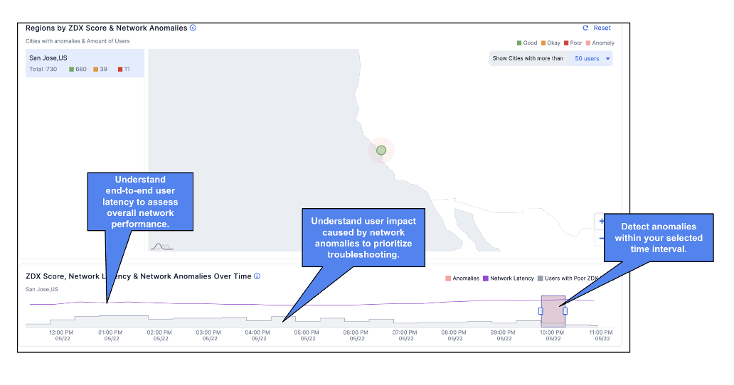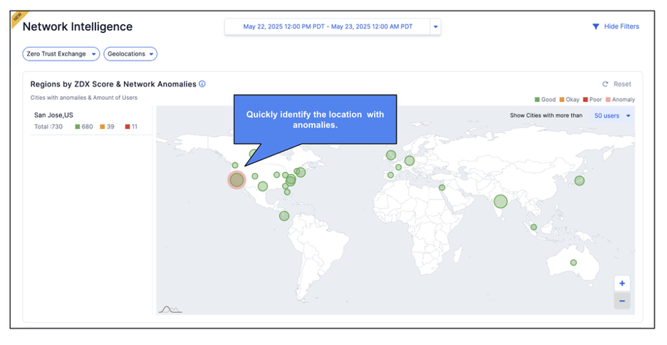 The Network Intelligence Dashboard provides end-to-end network visibility. Network teams can use this dashboard proactively or reactively to assess the health of their global network. Based on the impacted locations, they can drill down further to identify the root cause of issues. Additionally, they can correlate network problems with the ZDX score for each location to understand the potential impact and scale of the problem For example, if the average ZDX score in a specific geolocation is low and a majority of users are experiencing degraded performance—coinciding with a detected network anomaly—this strongly indicates that the network anomaly is negatively impacting user experience and contributing to the reduced score.
