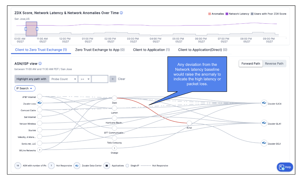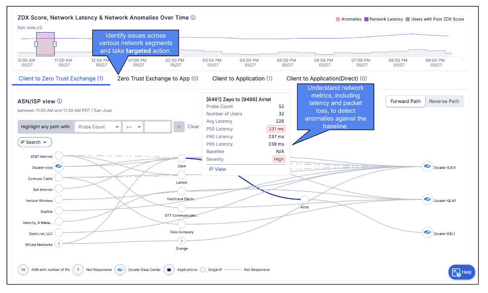 Today, millions of devices across various customer environments are deployed with Zscaler Client Connector running cloud probes at five-minute intervals. ZDX Network Intelligence leverages the cloud probe data and applies machine learning algorithms to establish a baseline for normal network performance. It continuously monitors for deviations in key metrics such as latency, packet loss, and jitter. When anomalies are detected, they are flagged as network issues, and the affected paths are visually represented with severity-based color coding: red for critical issues and yellow for moderate degradation. This enables faster root cause identification and enhances network troubleshooting efficiency.