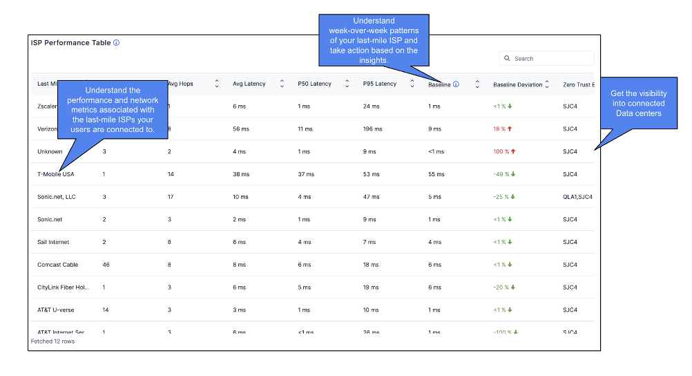 Understanding where network anomalies occur is critical for effective troubleshooting. With end-to-end network visibility, you can pinpoint whether issues arise within intermediate ISPs or at the last-mile ISP level. This visibility provides valuable insights into key network metrics such as latency and packet loss—enabling you to identify the root cause of degraded performance.