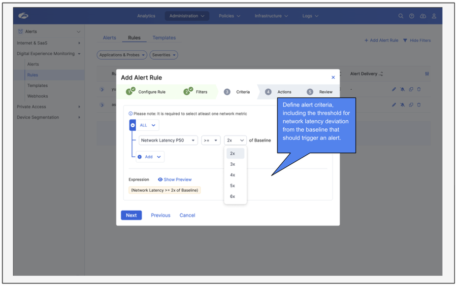 To effectively identify network anomalies or deviations from the established baseline, customers should be alerted proactively. Network Intelligence Alert Rules enable customers to configure alerts for any detected anomalies or baseline deviations. These rules offer flexibility to define thresholds for deviation intensity, minimum network latency criteria, and throttling conditions. This ensures customers receive advanced notifications when potential network issues arise, allowing for faster response and reduced impact.