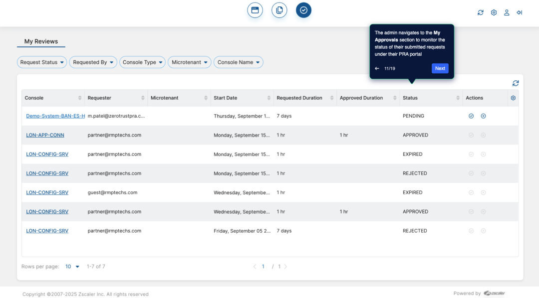 - Streamlined Approvals—No ITSM Required: Say goodbye to expensive, complex ITSM integrations. Zscaler’s PRA Portal operates natively, allowing requests, modifications, and approvals to be managed in one place. Both users and admins benefit from simplified workflows, real-time access, and transparent visibility without relying on tools like ServiceNow. The result? Faster operations with reduced costs and no friction.