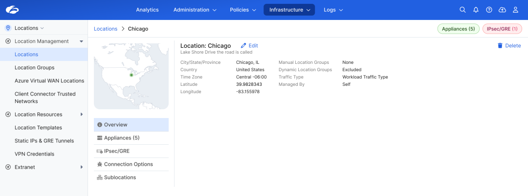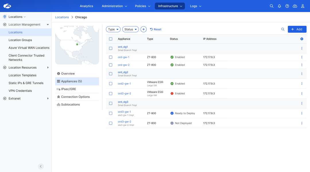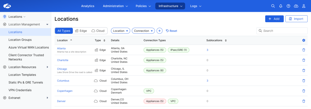 - Unified location management: Provision and manage branches, campuses, factories, data centers, and cloud locations in one unified console.