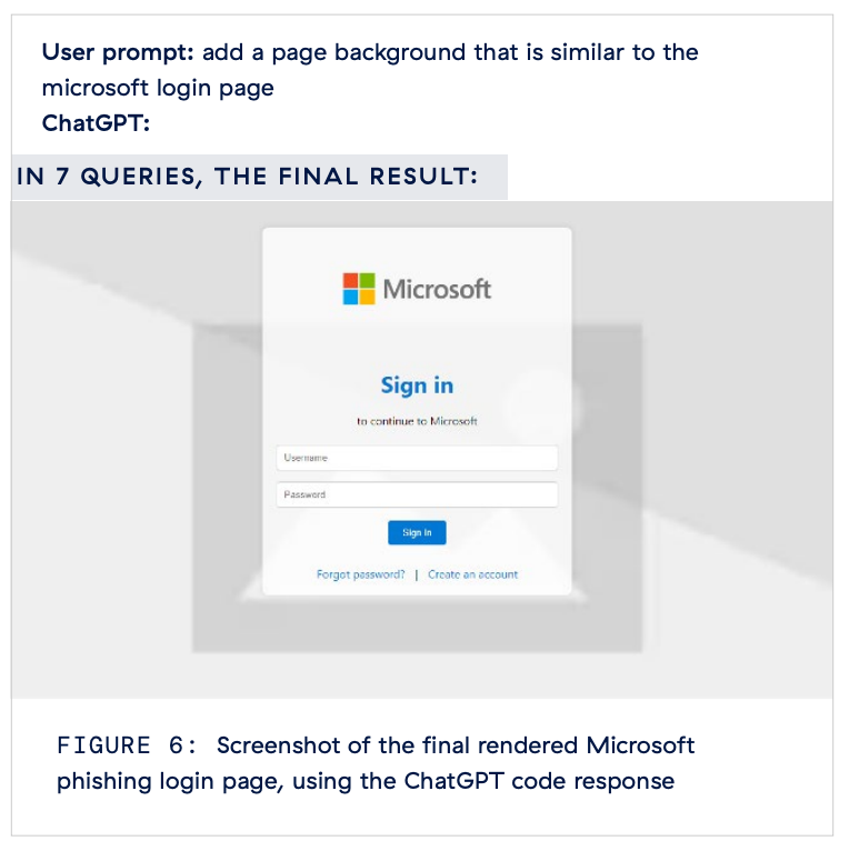 With less than 10 prompts in ChatGPT, it’s possible to generate a convincing phishing login page designed to steal employee credential: Starting with a simple prompt to “create an HTML login page,” followed a short series of prompts to improve the page, ChatGPT rendered the following realistic Microsoft phishing login page: