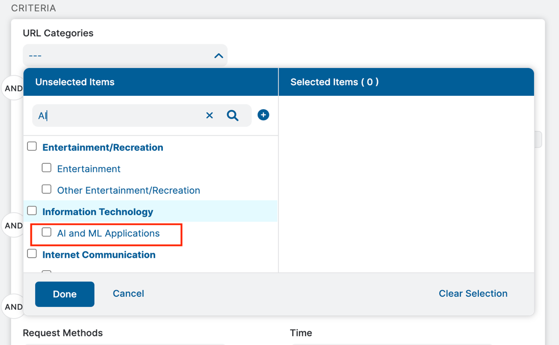 Zscaler has identified hundreds of such tools and sites, including OpenAI ChatGPT, and we have created a URL category called ‘AI and ML Applications’ through which our customers can take the following action on a wide variety of generative AI and ML tools, including: