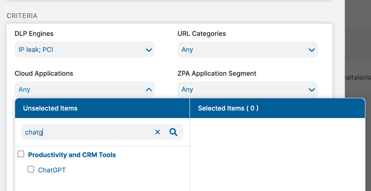 Since ChatGPT is the most popular AI application, we created a pre-defined ChatGPT Cloud Application to provide more preventive controls around it. For many organizations that do not want to block access to ChatGPT but are worried about data leakage and are concerned about giving up IP rights on content uploaded to ChatGPT, they can enable fine-grained DLP controls as well.