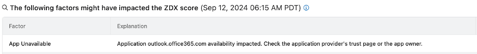 With a simple click in the ZDX dashboard, you can analyze a score, and ZDX will provide insight into potential issues. In the case of this Microsoft outage, ZDX highlights that the network is impacted.
