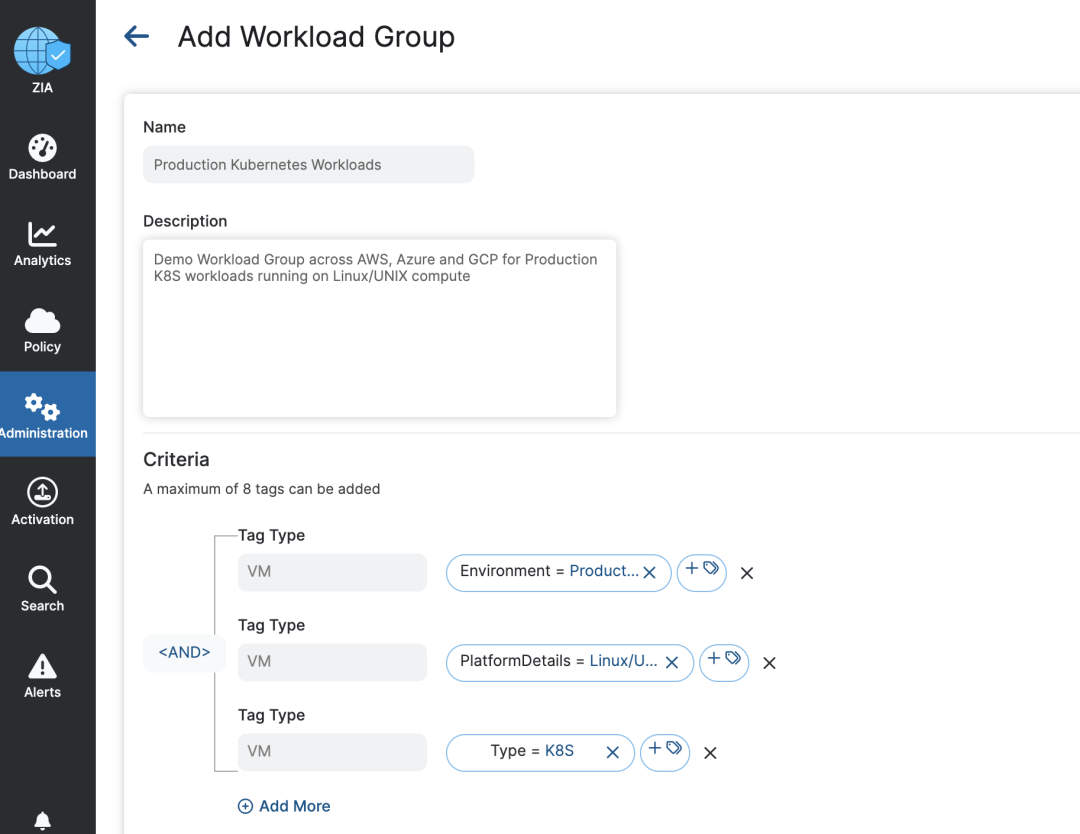 A Workload Group is made up of one or more (up to eight) key:value pairs with Boolean logic to define a set of tags and attributes. For example, you might have a Workload Group named “Production K8S Servers” with: Environment=Production AND Type=K8S AND Platform=Linux/UNIX