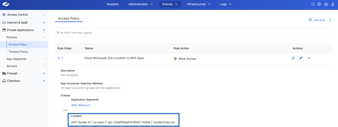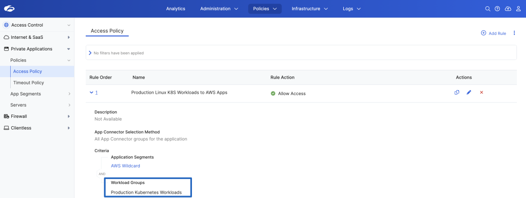 Whether the private applications are existing App Segments or brand-new additions, these workload-specific Access Policies can combine multiple criteria. For our “Production K8S Servers,” you might create a policy that includes the Applications AND the Workload Groups criteria. You can further refine access by adding a Location, ensuring only Cloud Connectors in a specific VPC or VNET match and allow traffic.