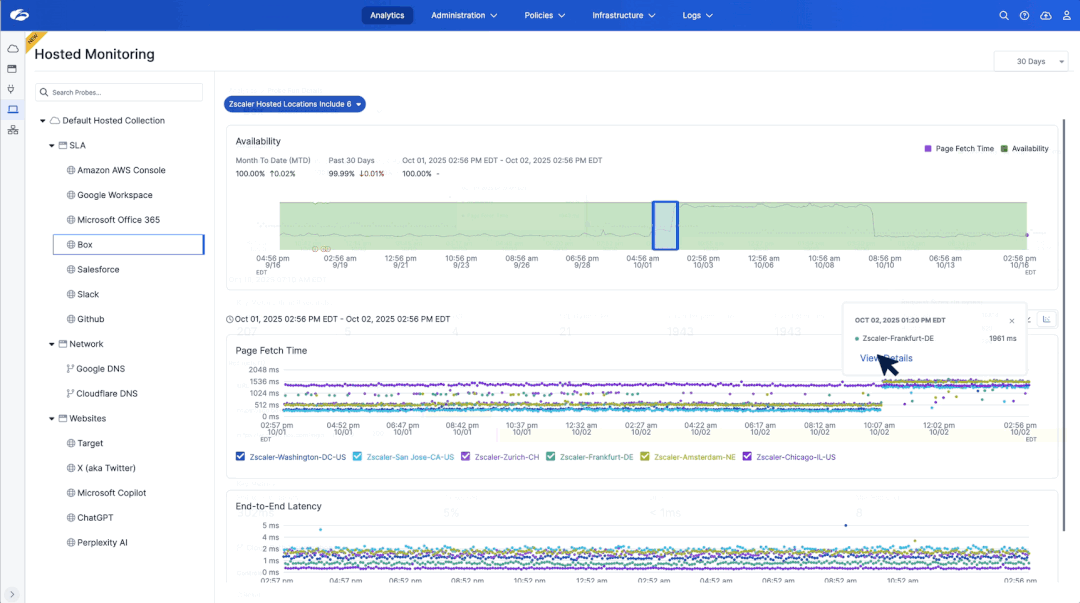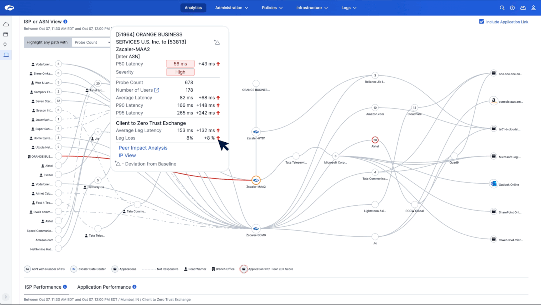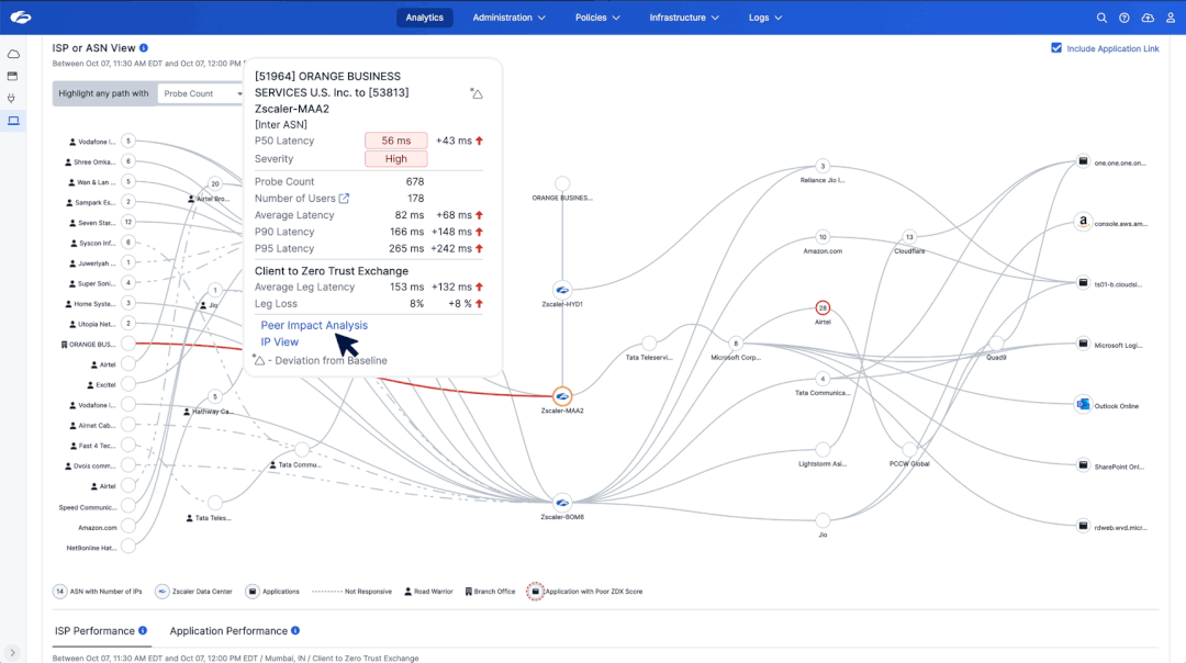 Every five minutes, Zscaler Client Connector launches lightweight cloud probes to collect telemetry — latency, packet loss, jitter — along the user’s exact route to the application. Through machine learning, these metrics are baselined and deviations are automatically flagged, giving teams real-time insights into which ISP is having performance issues and why performance degrades.