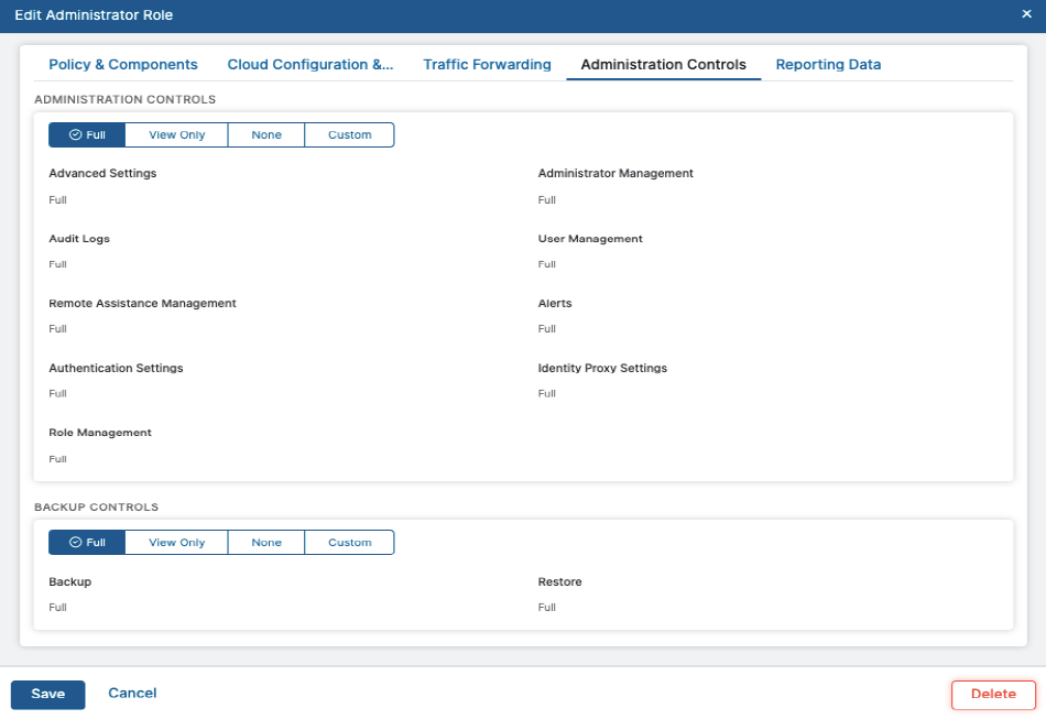 Zscaler’s RBAC enforces least privilege access in the admin console. Before adding administrator accounts, customers should define roles in the Admin Portal. Each administrator requires a role. The Super Administrator can select specific access rights for other administrators. This allows for fine-grained controls for policies, reports and other admin controls. The Super Administrator can restrict access to specific functional scopes within the Admin Portal. Access levels (create/edit, view only, or no access) depend on the role and scope of each administrator: