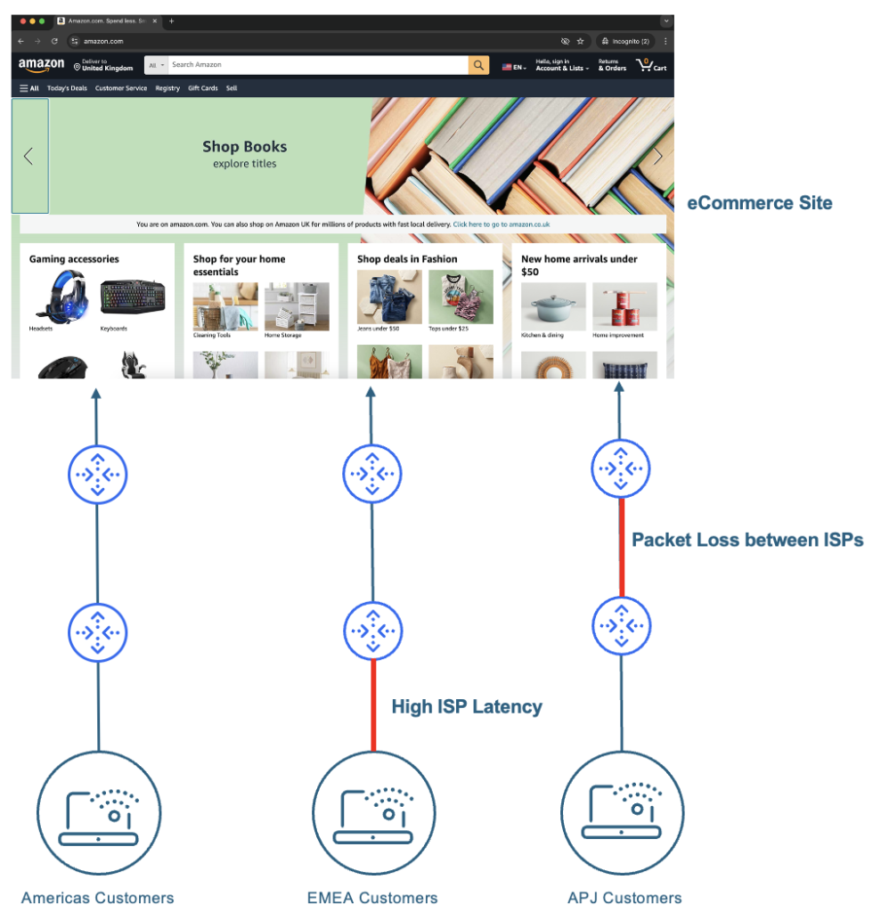 These disruptions are significant, but they only make up a small part of the total disruptions that have recently happened. They have affected employee productivity, customer experience, and overall business performance. That's why it's crucial to expand our monitoring strategy to cover all ISPs, applications, and services that our employees and customers rely on, across all locations, to access our business and customer-facing applications. For example, Microsoft Teams necessitates complex services to harmonize voice, video, and application sharing between the cloud and all meeting participants for flawless functionality. Similarly, monitoring your public-facing website, such as Amazon.com, from various global vantage points is crucial to identifying issues with updates or accessibility problems in specific regions, ensuring business continuity.