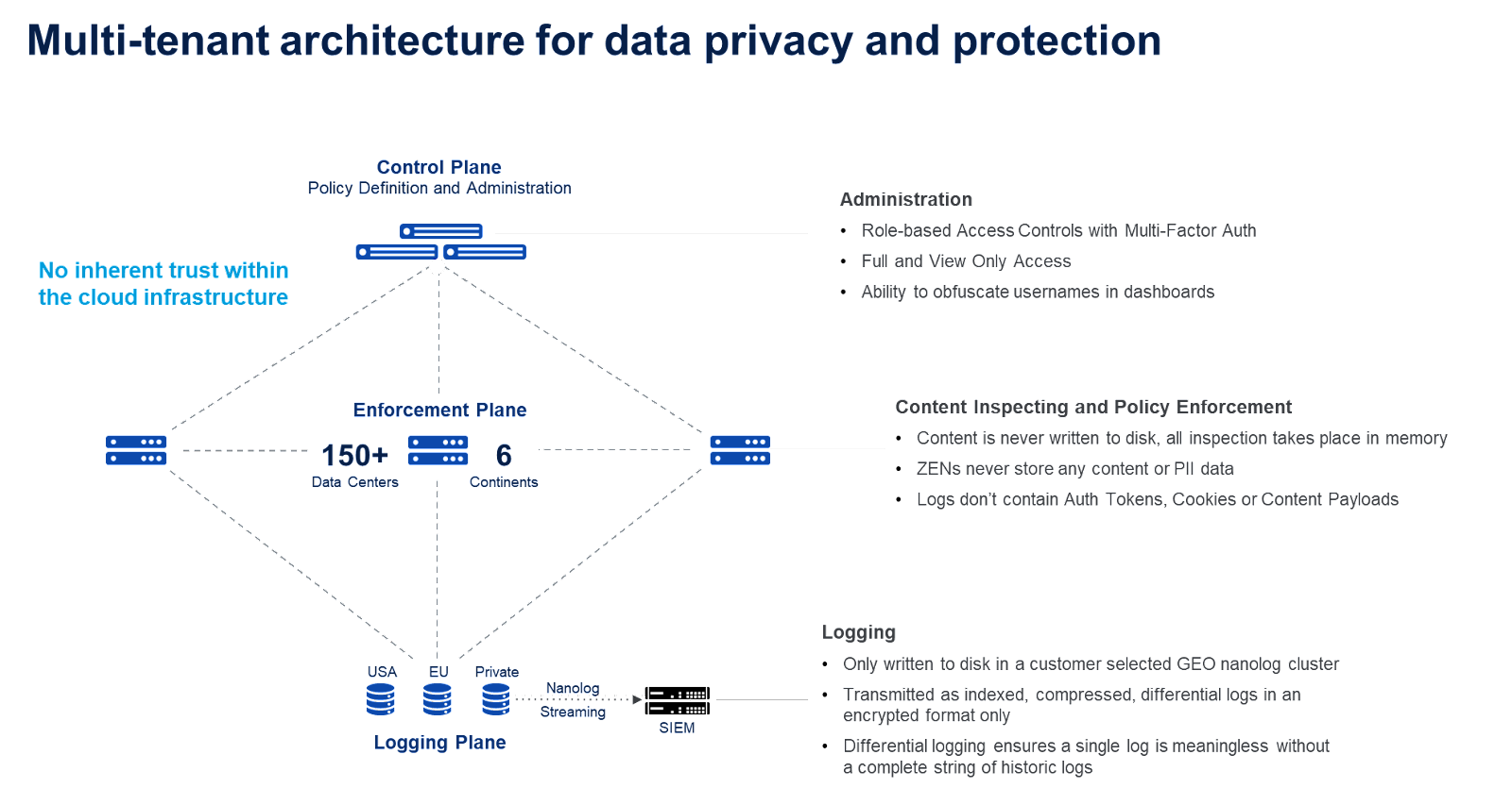 Security and privacy are at the core of Zscaler’s architecture. Our fundamental principle is that we should minimize the data sets that are collected, and secure them across the whole lifecycle - in-use, in-motion and at-rest. Details on the controls are illustrated in this image: