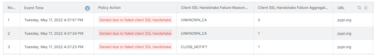 Example 1: Failed client SSL handshake logs proactively surface misbehaving clients: