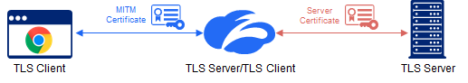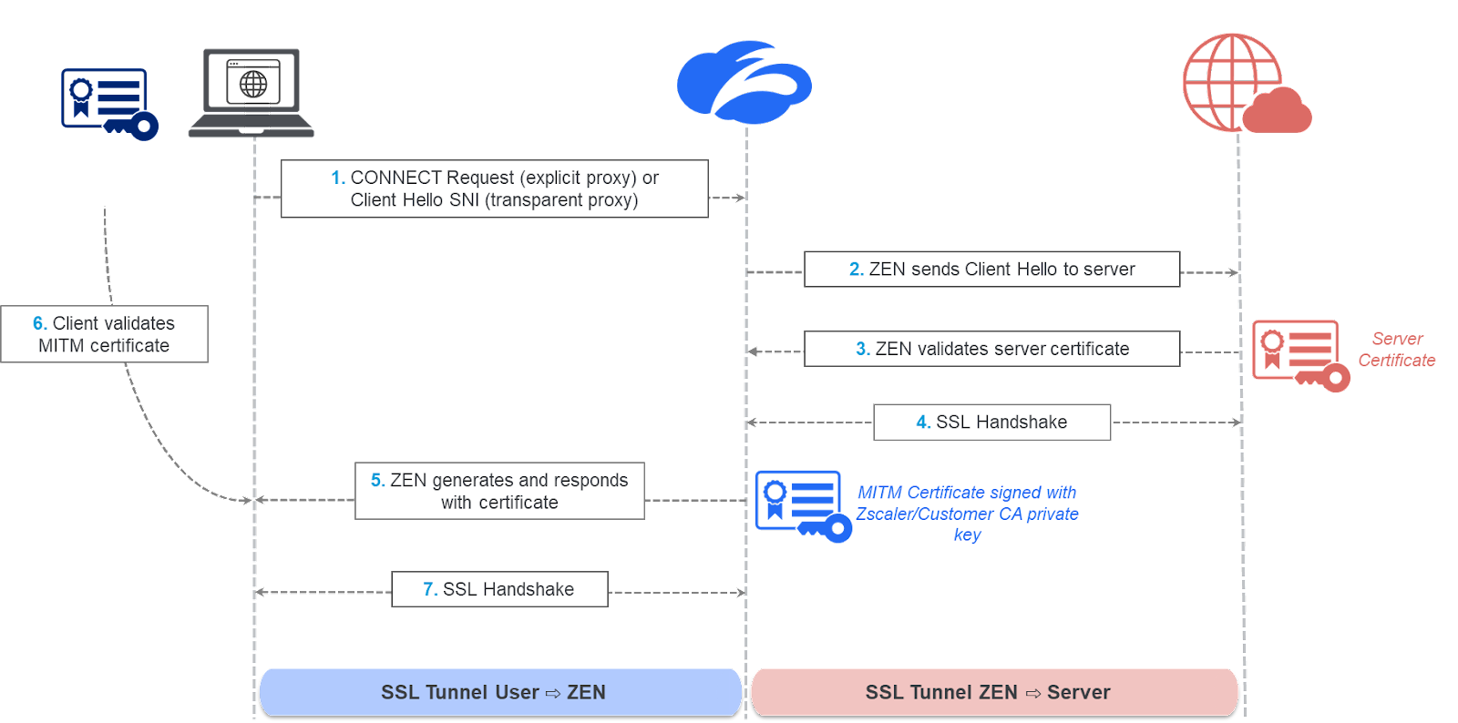 The ZIA Service Edge proxies the TLS connection by assuming the role of a TLS server to the TLS client (end-user application) and of a TLS client facing the destination TLS server. The service completes a server-side SSL handshake with the server, agreeing on a symmetric session key used to encrypt/decrypt the traffic on the server-side and validating the server’s certificate, similar to what your browser would do. Further, the service generates a domain certificate that looks like the original certificate, but is signed using the Zscaler intermediate CA or a customer intermediate CA private key. The service then sends the certificate to the client for validation and completes a client-side handshake, agreeing on a different symmetric session key used to encrypt/decrypt the traffic from on the client side.