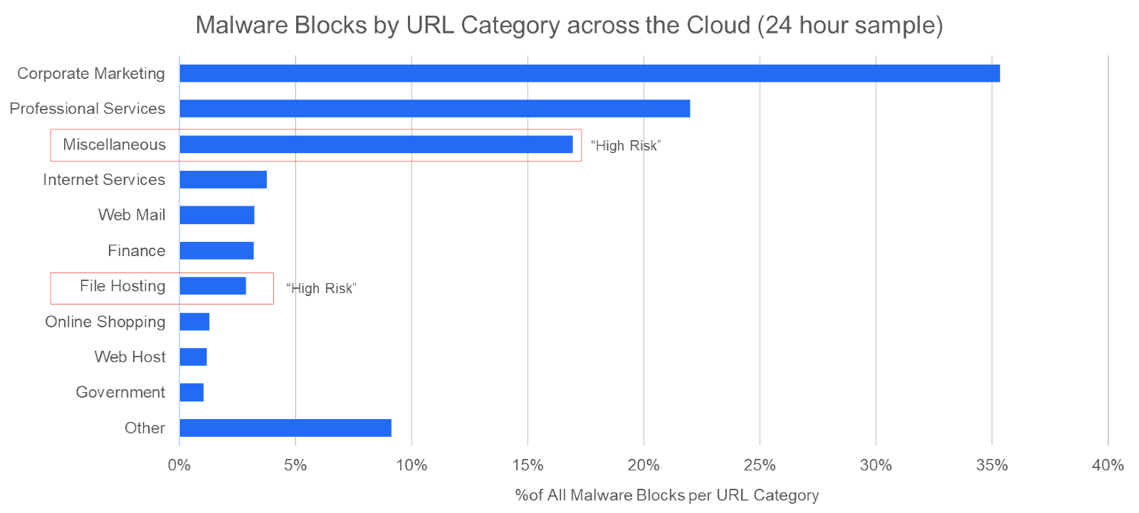 This is not only ironic (How is that for zero trust?), but also risky (literally). This advice puts a customer in a dystopian scenario where risk is unchecked, unmanaged and unmitigated. Zscaler is observing malware payloads across all URL categories, even those considered low/medium risk by the NGFW vendors: