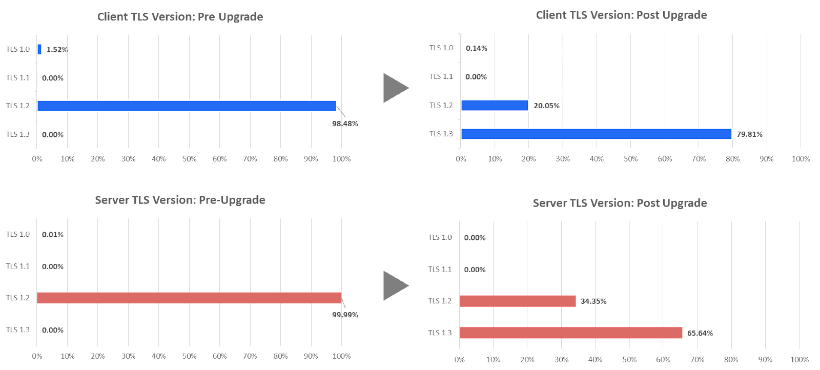 The following chart illustrates this principle nicely through the Zscaler TLS 1.3 acceleration hardware upgrade that was completed more than a year ago. Once we flipped the switch, we observed, overnight, a major difference in TLS version negotiation both on the client side and server side. Such a significant upgrade was a no-event for a customer. Imagine that you had to manually upgrade hardware, OS, drivers on your legacy NGFW appliances to get through this.