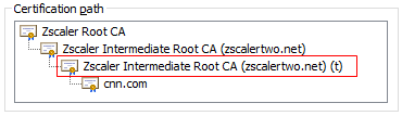 To mitigate this risk, Zscaler employs a robust array of key material safeguarding techniques - from short-lived keys, revocation endpoints, to stringent production access and audit along with other compensatory management, operational and technical safeguards. The highlighted CA below (t stands for temp), showcases Zscaler’s short-lived issuing CA that is automatically rotated on a weekly basis, significantly minimizing potential attack windows.