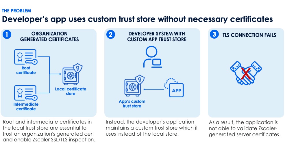 - Non-standard certificate stores: Many development tools and apps do not use the default system certificate store or do not trust Zscaler's certificates. This leads to trust issues with TLS/SSL certificates that, in turn, cause unexpected errors or behaviors that otherwise would not appear.