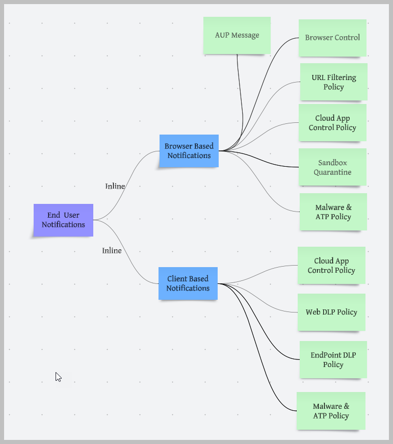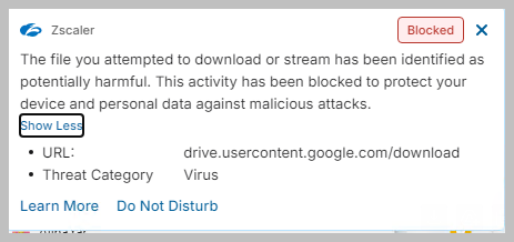 Browser and/or client block notifications for Malware violations | Use browser-based block notifications to inform users of malware policies. Client block notifications are very helpful for non-web applications like Slack, or API applications like Google Drive downloads |