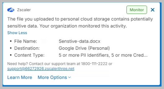 Caution or block sensitive file uploads to unsanctioned applications based on DLP policies. | Block or caution users regarding sensitive data uploads to personal applications or other unsanctioned instances or applications, including applications that might not support HTML rendering for browser-based notifications. |