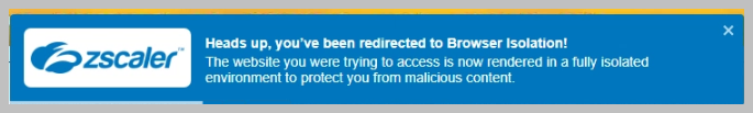 Example of a browser isolation notification when the end user attempts to visit a risky website