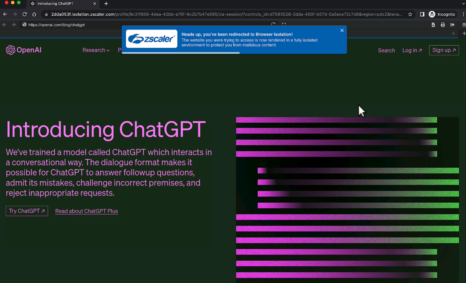At Zscaler, we hear from organizations on both sides of the ChatGPT coin, which is why we offer various actions with respect to accessing these sites. Isolation can help in the following ways.