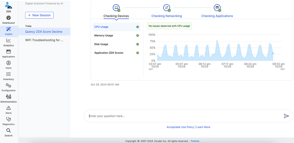 ZDX Copilot checks device, networking, and applications issues to identify root cause:
