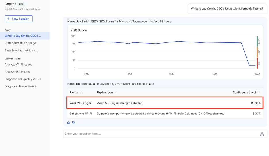 ZDX Copilot identifies root cause through natural language interactions: