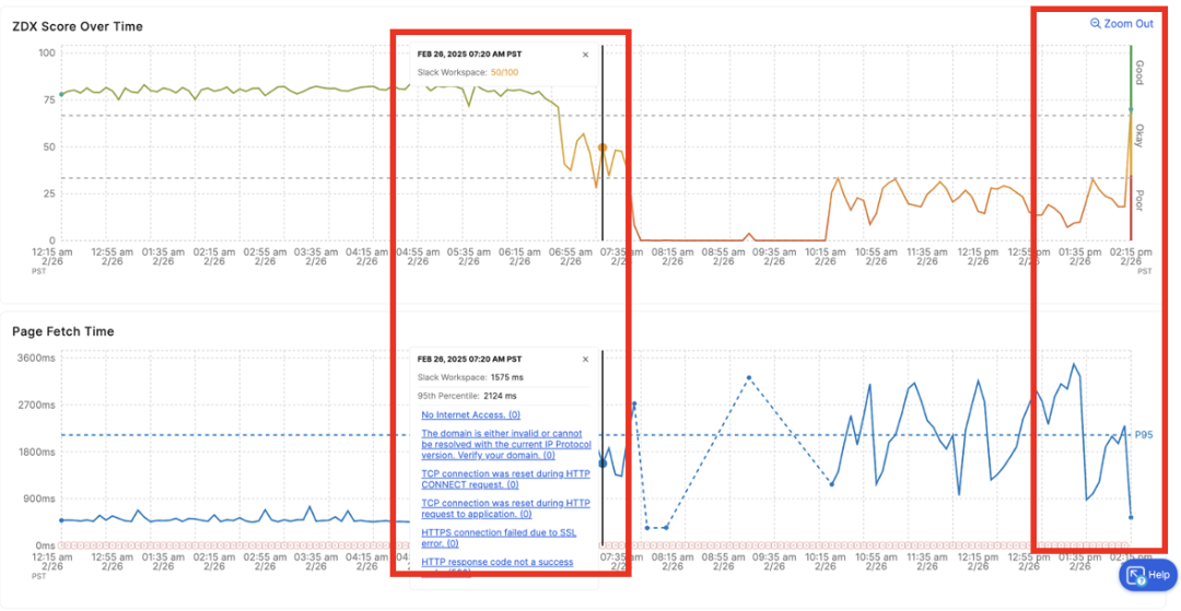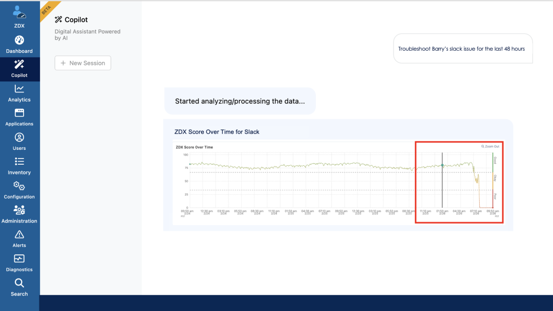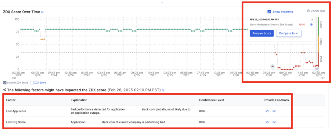 When users began reporting Slack disruptions on February 26, ZDX monitored performance trends, providing actionable insights into metrics like HTTP response codes and application reachability. Simultaneously, Copilot offered human-like assistance, enabling IT to drill into specific incidents without wading through raw data.