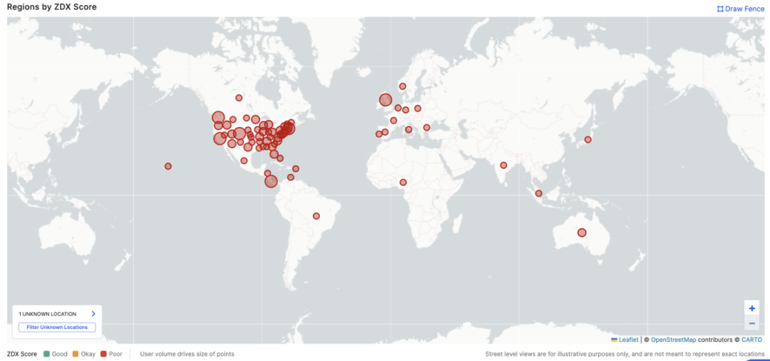 ZDX also played a pivotal role during this Slack outage by quickly detecting a significant decline in user experience scores for Slack services. Leveraging the ZDX heatmap, IT teams could instantly see the geographic concentration of the impact. This level of visibility allowed service desks to determine that the problem was external—centered on Slack itself—rather than an internal network or device issue.
