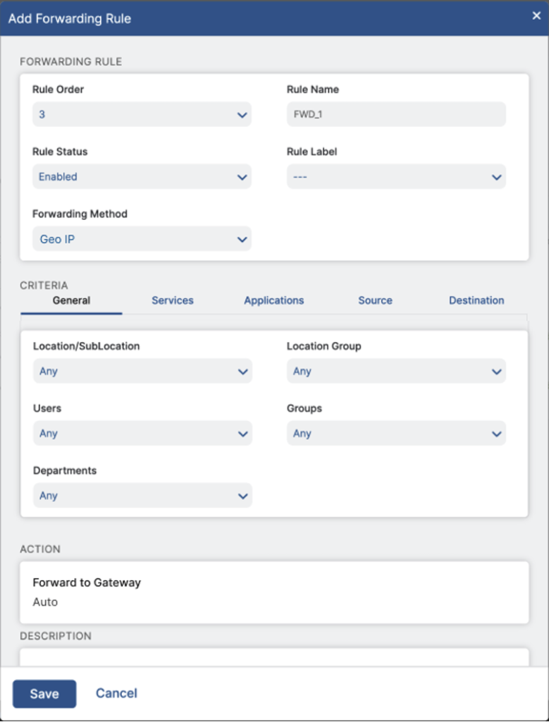 As a ZIA operators/administrators, you can navigate to the Forwarding Control under Policy in the ZIA Admin console and create a policy with the Forwarding gateway method selected as “GeoIP”. If you have other forwarding rules configured already, you can customize the rule order. You can then select the criteria that you want to apply, including users, groups, departments, destinations, source IPs, applications, and so on.