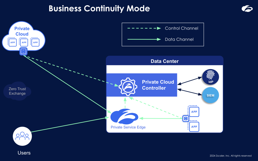 Business Continuity for ZPA is powered by Private Cloud Controllers (PCCs), which are deployed as a software package on-premises in the customer’s infrastructure. PCCs function as the brains of the operation and along with Private Service Edges (PSEs) to deliver uninterrupted policy enforced access to private applications even when the Zscaler Cloud is unreachable.