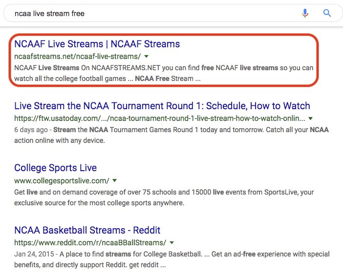 Searching for "ncaa live stream free" in Google resulted in multiple phishing links in the top 50 results.